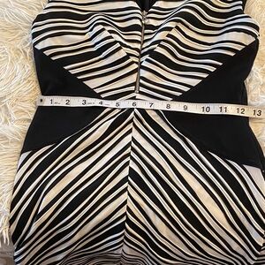 Get ready to turn heads in this fabulous sheath dress from Betsy Johnson! This size 2 beauty features a striking black and white diagonal stripe print that's both playful and sophisticated. The strategic black side panels create a beautiful silhouette. A functional silver-tone zipper runs down the front, adding a modern touch. Crafted from a high-stretch fabric (92% polyester, 9% spandex), this dress offers exceptional comfort and a flawless fit that moves with you. The smooth 100% polyester lining ensures a comfortable feel. Perfect for day or night! Made in Vietnam. In perfect condition, like new! Zips up the back. This dress is above the knee by a few inches. Measurements in pictures