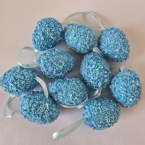 Set of 10 blue sequin decorative eggs with ribbon loops. Perfect for crafts or home decor.