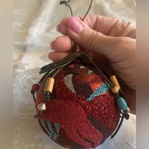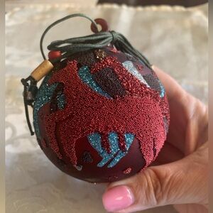 A beautiful and unique vintage glass ornament. The ornament is burgundy color and has turquoise, brown, and burgundy horses on it. The horses are beaded and/or glitter. The back of the ornament has glitter arrowheads. The ornament hangs from your tree with a thin brown piece of leather that has beads on it. Perfect for anyone who loves southwestern items. The ornament is approximately 3 1/2.