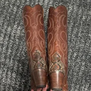 Idyllwind leather cowboy boots with snakeskin detail at heel and toe. Size 9.5 with a 2.5” heel; 15” shaft