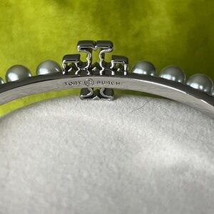 Tory Burch Kira Pearl Cuff bracelet in silver plated brass with glass pearls.