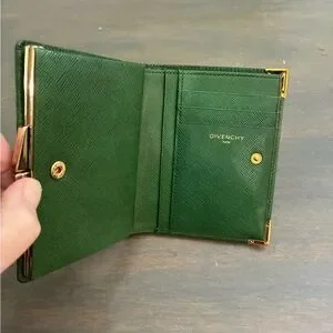 Chic Givenchy wallet in forest green. Gold corner details add elegance.