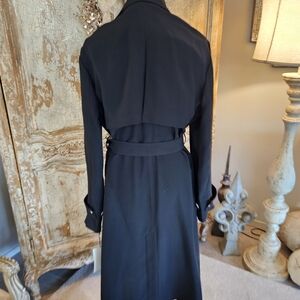 Elegant black trench coat with double-breasted design. Features a belted waist and gold buttons. Perfect for a sophisticated look.