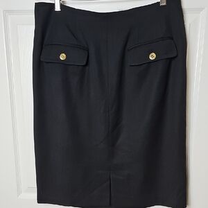 Celine skirt with gold buttons also marked Celine. Classic design with a front vent. Beautifully lined. No material tag but skirt is made of a very fine soft wool. No imperfections or signs of wear. Buttons have tiny scratches when viewed up close.