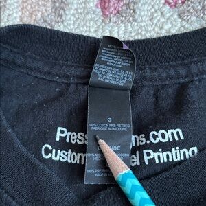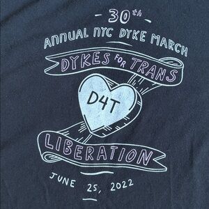 Made expressly for the June 25, 2022 (the 30th Annual) NYC Dyke March, the front of the tee has a 3D heart that says DYKE. The graphic heart looks almost like a candy heart in pop art style. Some of the transfer is cracking, but it may have been designed like that. The back of the shirt has another heart with D4T (Dykes for Trans). This was made for Pride in 2022 and is in EUC, with some wear from washing. The tee is black and the tattoo-inspired graphics are white with some lavender. It’s a custom design from presstdesigns.com