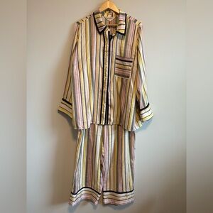Chic and comfortable satin pajama set with multicolor stripes. Features button-up top and matching pants.
