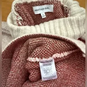 Cozy statement turtleneck sweater by Another Girl featuring a bold abstract colorblock design in red, cream, brown & sage green. Soft fuzzy knit with a relaxed oversized XL fit — warm, comfy, and perfect for fall/winter layering.