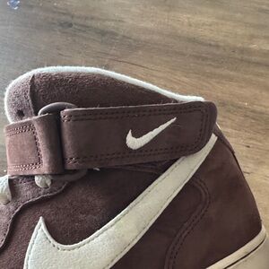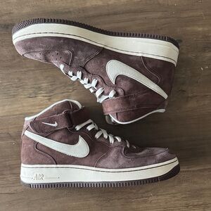 These are a limited edition pair of Nike Air AF1 mids in suede chocolate brown with cream suede accents. Top Velcro tab. Excellent condition. Only very minor wear on outsole and insole. Very soft suede. Don’t miss out