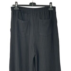 Effortless elegance defines these black ribbed knit pants, a versatile addition to any wardrobe. The wide-leg silhouette offers a relaxed and comfortable fit, perfect for lounging or stepping out in style. Featuring a comfortable elastic waistband and convenient side pockets, these pants blend practicality with chic design. The vertical ribbed texture adds a touch of sophistication, elevating the overall look. Ideal for a casual brunch, a relaxed day at home, or a stylish travel outfit, these pants are a must-have for those seeking comfort and style.
