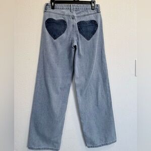 Super cute and eye-catching light wash denim jeans featuring heart-shaped back pocket patches that give major Y2K / coquette vibes 💙✨