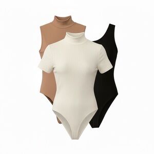 Set of three bodysuits. Includes a black, white turtleneck tee, and brown sleeveless. Perfect for layering.