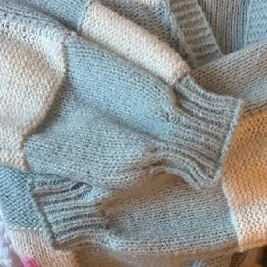 Cozy cardigan with heart pattern. Soft blue and pink hues. Like new