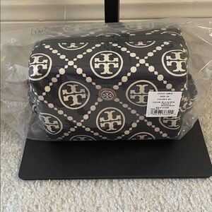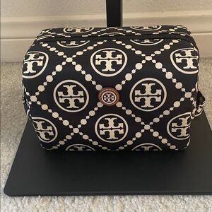 Stylish Tory Burch cosmetic bag. Features iconic logo pattern. Perfect for organizing essentials.