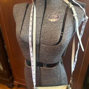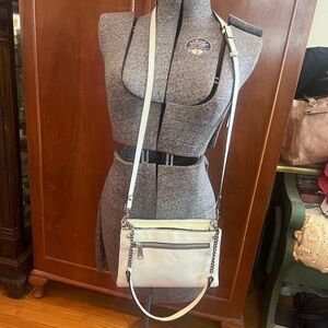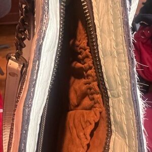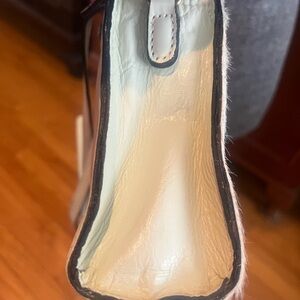 Sand color full grain leather on one side and calfskin on other side with faux suede interior. Burned edge finish. Zip closure main compartment with zip front pocket. 2 removable straps. Adjustable long strap. Main compartment has zipper pocket with 2 other small pockets.