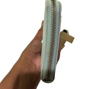 Crafted from smooth leather. Typically lined with Capital Kate jacquard lining and includes standard wallet features like credit card slots and bill compartments.