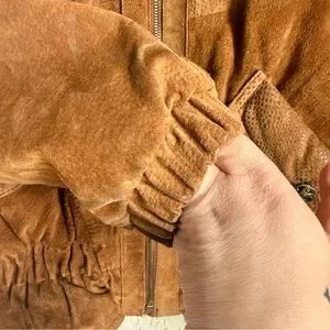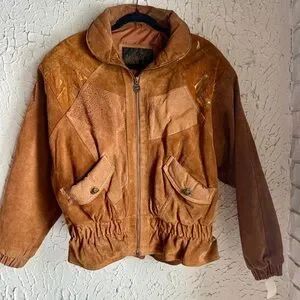 Unique and eye-catching Wilnit leather jacket featuring a rich brown patchwork leather design with gathered waist and cuffs for a flattering, slightly cropped silhouette. This jacket has a classic vintage boho / Western aesthetic that pairs perfectly with denim, boots, and layered fall looks.