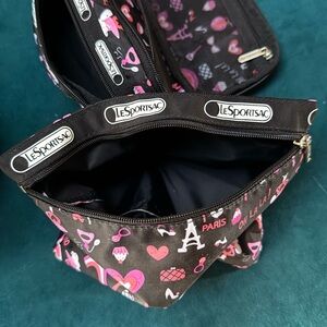 LeSportsac zip-top tote bag set featuring the "Paris Oh La La" print. Set of 3 bags. Super lightweight nylon great for travel.