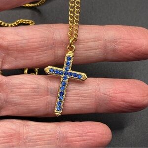 Goldtone Cross Blue Rhinestone Cross Pendant Vintage Necklace. Gold cross with blue rhinestones on goldtone chain which measures 18" and circle clasp. Very good condition, rhinestones intact. #C-2