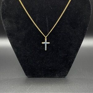 Goldtone Cross Necklace Blue Rhinestone Cross Pendant Vintage Necklace