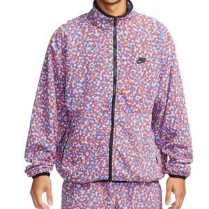 Such a fun and unique Nike fleece — this one feels like a hidden gem. Cozy midweight fleece with an all-over multicolor dotted pattern in red, blue, and teal tones. Full zip front, zippered pockets, and subtle embroidered Nike swoosh at chest.