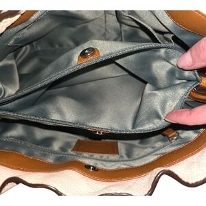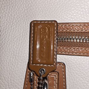 Exterior: Two tan leather shoulder straps, nickel hardware, Coach hang tag, zippered pocket on front, four feet on bottom