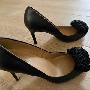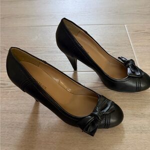 2 pairs of Ann Taylor black leather heels size 7 one pair with bow and the other with rosettes both used in good condition comes from a pet free smoke free home. Asking 38 dollars each or both for 70