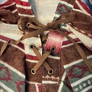 Stylish blouse with ruffle details. Features brown and blue stripes. Perfect for casual wear.