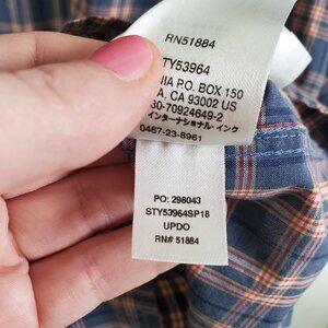 Color: blue, with a red, yellow and grey plaid print pattern