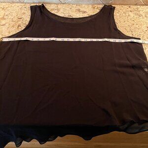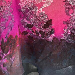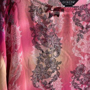 Photos do not do justice to the exquisite colors in this Citron Santa Monica silk blouse. The black shell attaches to the outer garment at the shoulder with hidden snaps. Size tag removed for discretion. Uneven hem (both outer garment and shell). P2P of the black shell is approximately 23.5 inches. Single owner. Preloved. Wrinkled because it has been stored folded in spare closet.