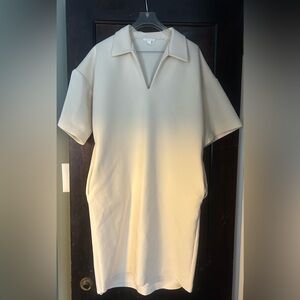 Elegant cream dress with a relaxed fit. Features a V-neck and short sleeves. Perfect for any occasion.