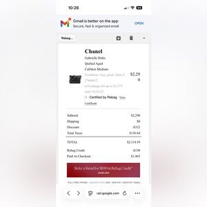 Chanel Gabrielle Medium. Bought on rebag and used it once (receipt is on the last picture). I do have it stuffed to maintain shape but it does sag when taking it out. Other than that, no other issues.