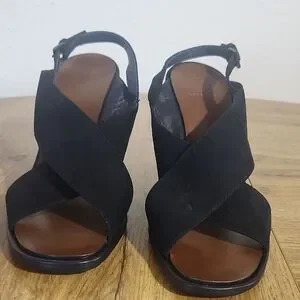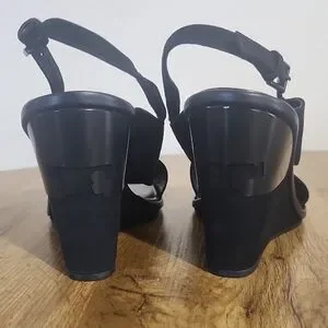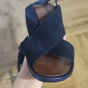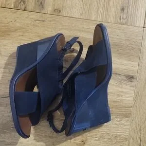 Stylish Navy wedge sandals with a brown insole. Perfect for any occasion.