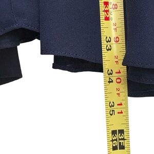 The dress is an A-line, fit-and-flare style, and features a colorful geometric bodice and a flowing lined navy blue chiffon skirt. Dress is lightweight and has a hidden back zipper for closure.