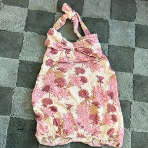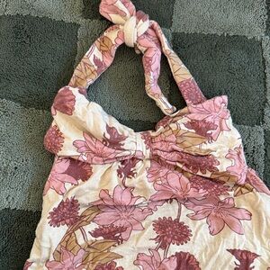 Charming one piece with pink floral design. Features a bow and halter neck.