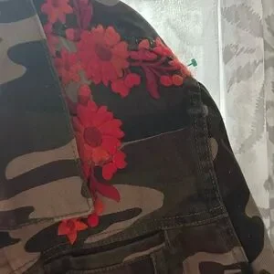 Stylish camouflage jean jacket. Features bold red floral accents. Perfect for a standout look.