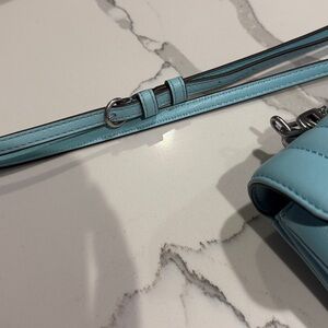 Tory Burch Mini Kira Top handle bag - baby blue w/silver hardware . Purchased from Nordstrom for $398 (see receipt) . Inside is absolutely immaculate and has a built in card holder . Outside looks great …has a few tiny flaws….one being on the back of the short handle , but the short handle falls to the back of the purse ….its very minor ….and there is the tiniest rub or scratch next to the logo on the front (I bet you can’t even see it , but I took a pic). Not even noticeable unless you look at it from like 2 inches away. I disclose every flaw. Aside from that it looks brand new. I carried this 2 times to an event .