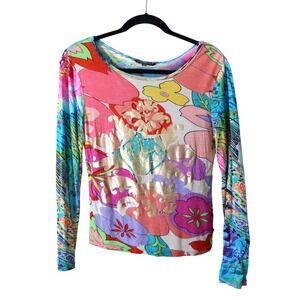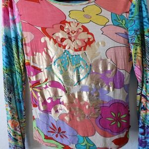 Super colorful and retro Vintage long sleeve Y2K babydoll tee top by Chaudry KC in a size small. This eye-catching piece showcases a bold floral print pop art design & Toile de Jouy metallic gold accents. This top is a super unique Christian Dior dupe from the 2000s. One of the most interesting vintage pieces I've ever come across so I won't want to part with it for less! Serious buyers only, please. :) I want this to go to the perfect home. <3