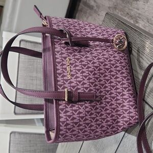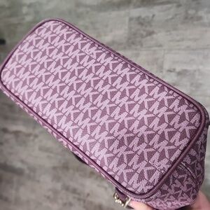 Great pre loved condition Michael Kors Purple Signature Bag. This elegant bag features a rich purple hue and the iconic MK logo, comes with removable crossbodt strap. clean interior, clean corners, only 1 call out one strap has a piece of piping missing as shown in last pic. hardly noticeable. can add a twilly. Great purse 10 x 7" purse