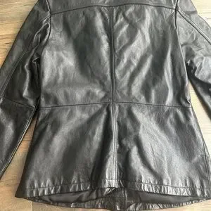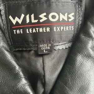Sleek black leather jacket by Wilson. Features button closure and front pockets. Timeless and versatile design.