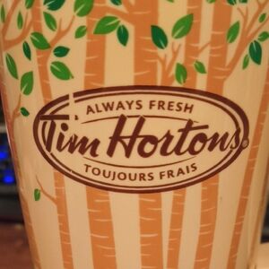 Classic Canadiana! This is the iconic vintage Tim Hortons "Always Fresh" travel mug featuring the wrap-around birch tree/forest graphic. This is the hard-to-find Extra Large 24oz (710ml) size, significantly bigger than the standard commuter mugs.