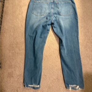 High rise skinny jeans in classic blue. Distressing at the ankle.