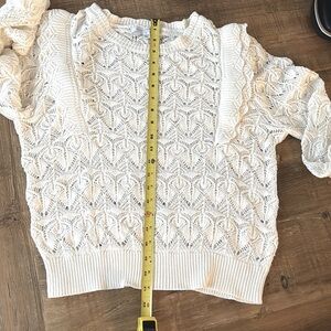 Product Features: Boat neck, Long balloon sleeves, Pullover style, All over sheer pointelle, Ruffle trim, Imported, Size & Fit- true to size. See pics for measurements. NWT/ Smoke free home.