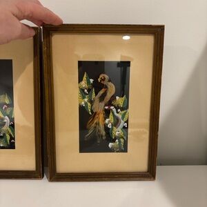 A pair of Vintage Mexican bird feather art paintings, in wood frames - in the first pic, the white spots are just the glare on the glass, from my light