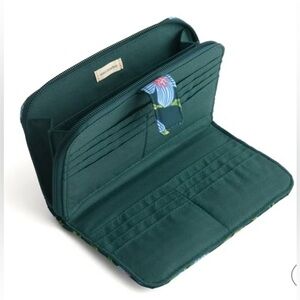 This spacious wallet offers ample room for your cards, cash, coins and more, keeping everything neatly organized and easily accessible. Details: Exterior features a back zip pocket. Front compartment features 12 card slip pockets and two bill slip pockets. Main zip compartment features a divider. Snap and zip closures.