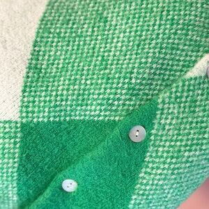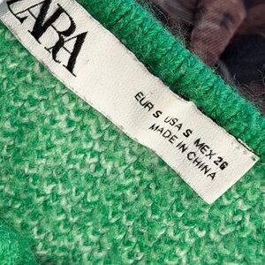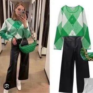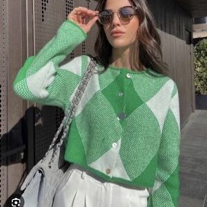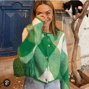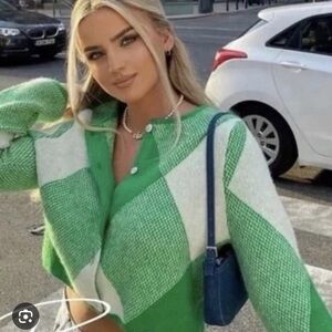 Chic Zara cardigan with bold green and cream pattern. Ideal for layering and adding flair to your outfit.