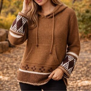 Cozy Earthbound Trading Co. knit Baja-style hoodie sweater in a warm brown color with cream and dark brown geometric detailing on the sleeves and hem. It has a relaxed hood, front kangaroo pocket, and soft textured knit.