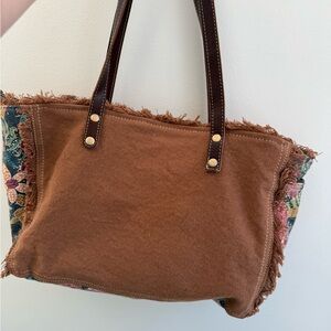 Chic tote with floral design. Features brown leather handles. Perfect for everyday use.