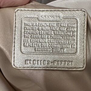 Elegant Coach tote in cream. Features gold hardware and decorative scarf. Perfect for everyday use.
