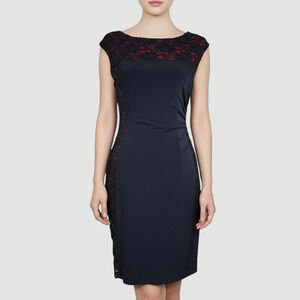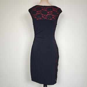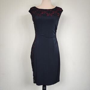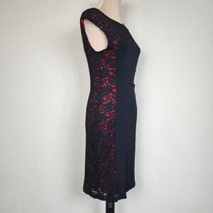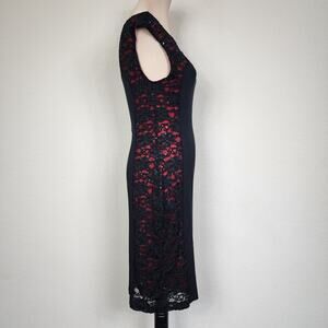 Sexy and gothic little black dress with red undertone and sparkly lace accents. A flattering and slimming fit!