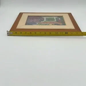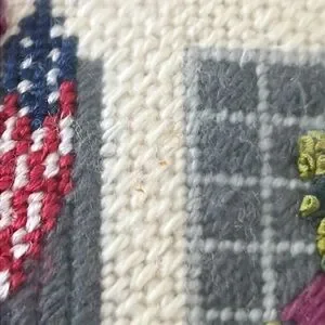 Signed Framed Crewel & Crossstitch Cottage/Garden Scene w/ American Flag - 15x12